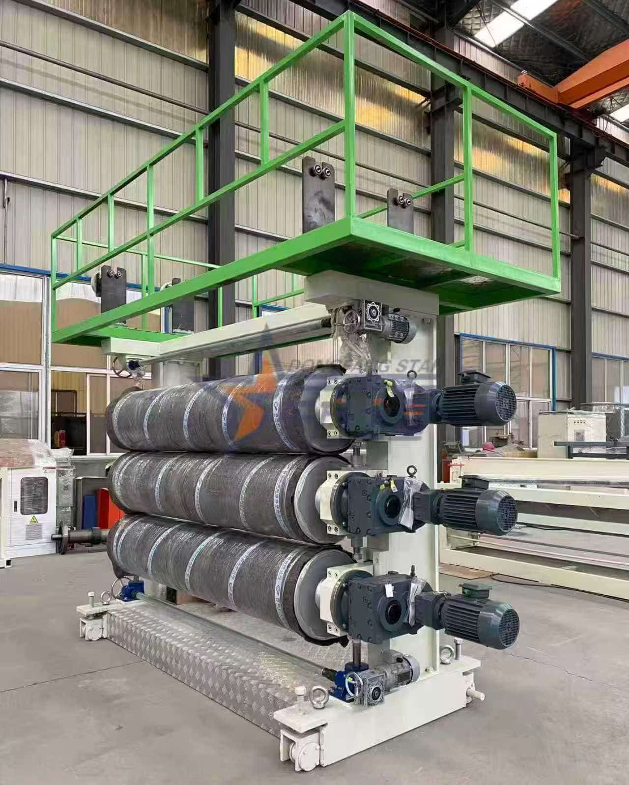 Descrição: Rolos de acabamento espelhado de grande diâmetro de ∮450 mm × 2200 mm (dureza RC60-65) com controle de temperatura independente e sistemas de acionamento. A temperatura uniforme e constante da superfície do rolo permite a rápida moldagem e eliminação de marcas de fluxo, fundamental para a produção de carcaças de eletrodomésticos e painéis publicitários de alta qualidade.