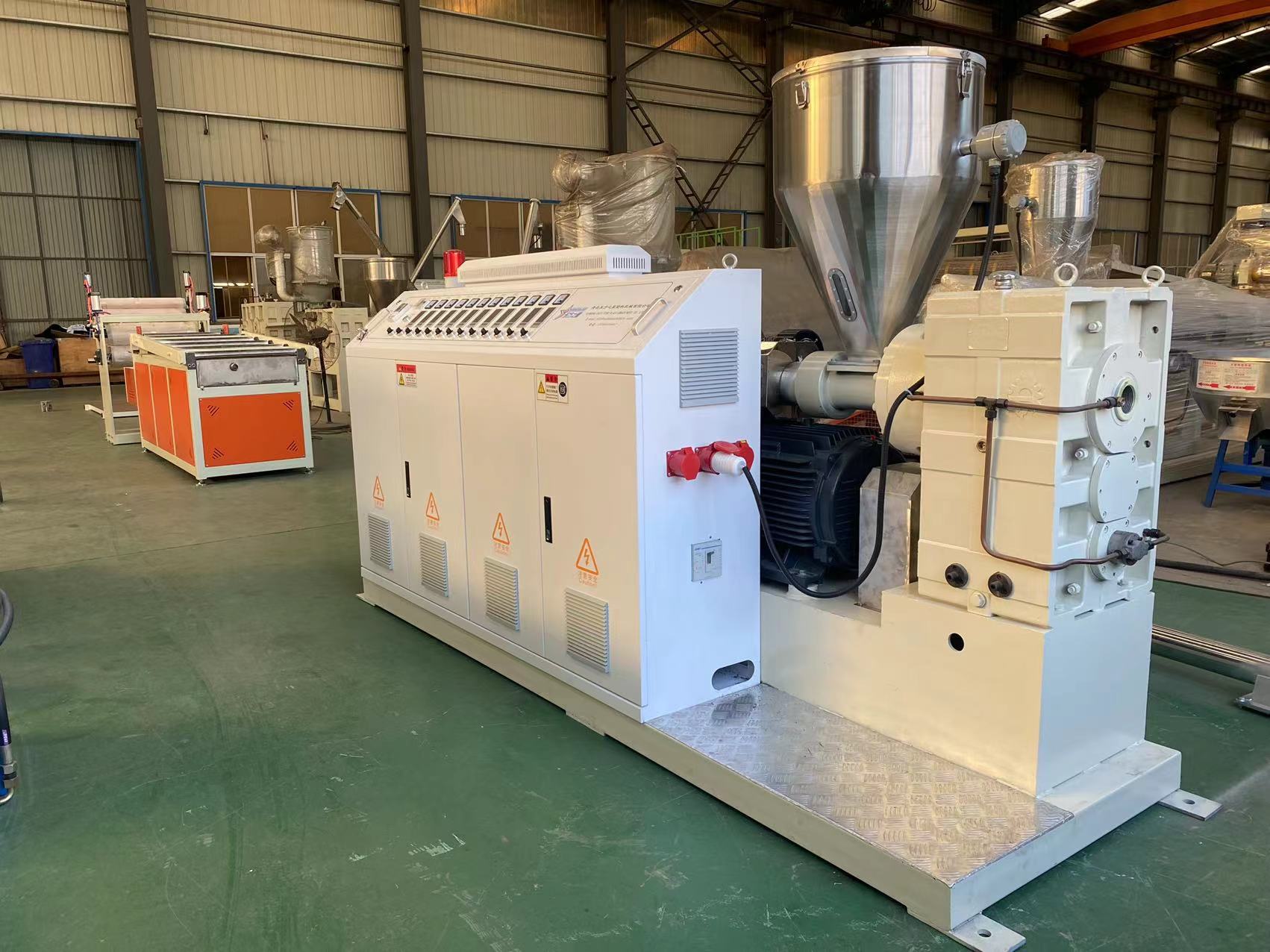 O sistema de extrusão central desteLinha de produção de cortina de porta flexível de PVCadota um design de parafuso único com um diâmetro de parafuso de 90 mm e uma relação comprimento/diâmetro de 33:1, otimizado especificamente para as características das matérias-primas de PVC. A extrusora está equipada com um sistema de aquecimento de 6 zonas com potência de aquecimento de 24KW, utilizando serpentinas de aquecimento em alumínio fundido e refrigeração por ventilador. O motor principal é um motor CA de 37KW, com regulação precisa de velocidade obtida através de um conversor de frequência Weichuang. Os parafusos e barris doEquipamento de cortina flexível de PVCsão feitos de material 38CrMoAIA, com profundidade de nitretação de 0,4-0,7 mm para garantir resistência ao desgaste e vida útil.