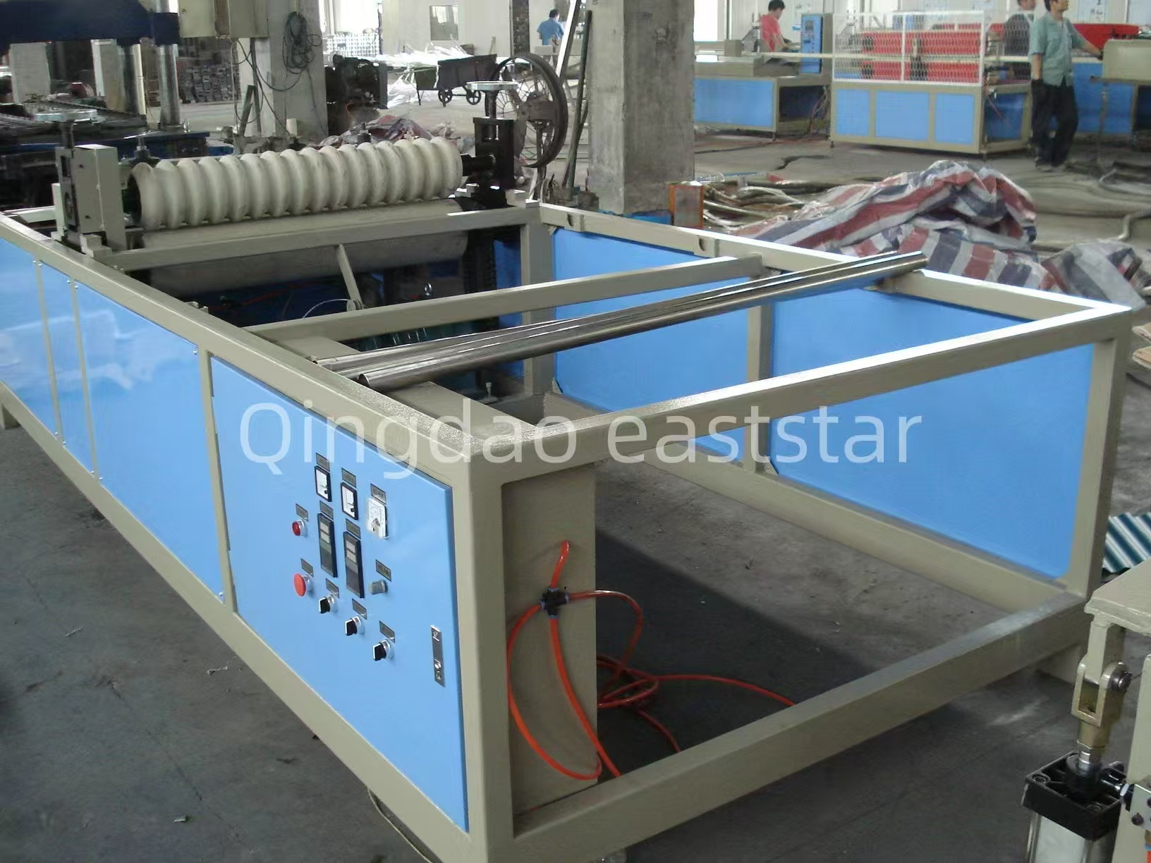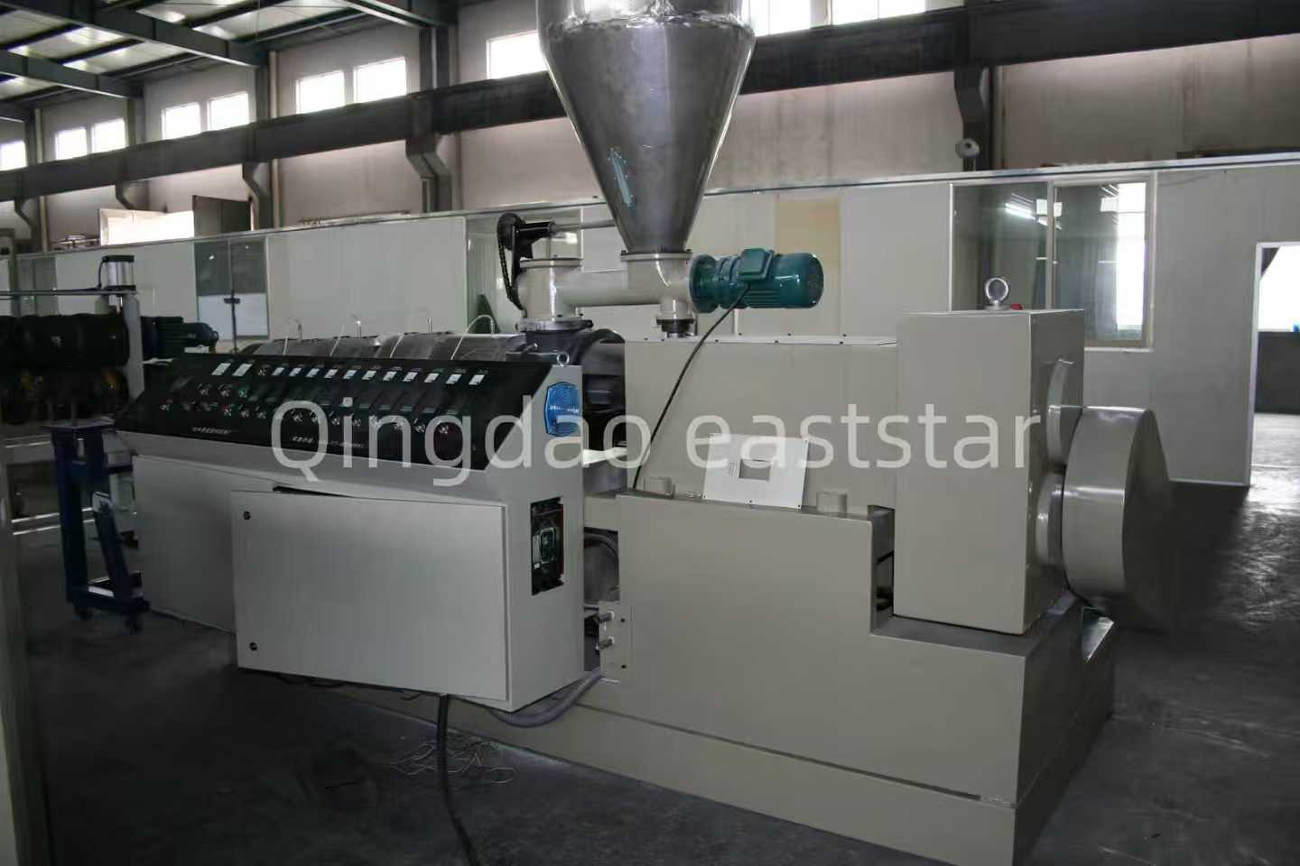 O equipamento principal doLinha de produção de chapa ondulada de coextrusão PC+ASAinclui duas extrusoras de parafuso único, SJ-120 e SJ-40, usadas para extrusar a camada PC e a camada ASA, respectivamente.