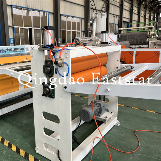 Máquina de folha macia para equipamento de tapete antiderrapante de PVC: O equipamento consiste principalmente em uma extrusora de parafuso único, uma calandra de três rolos, um resfriamento de 6 metros